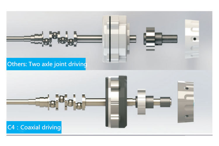 Thiết kế trục liền đồng trục làm giảm lực momen xoắn của máy, giúp máy hoạt động ổn định hơn, đồng thời tuổi thọ của máy tốt hơn.